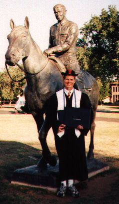 | Look! I finally graduated! Wearing the hat that got me spots on national television many times at basketball games while I played with the Texas Tech Court Jesters Basketball Band, as well as tennis shoes that traveled many miles across campus over the five years I served, I hold the coveted degrees. *sigh* Notice the grin on Will Rogers' face! He later told me that he was proud of my hard work then asked me to give his horse, Soapsuds some hay. Needless to say: old Soapsuds wasn't too hungry. | | |